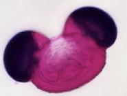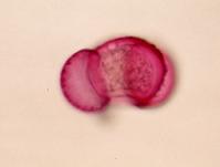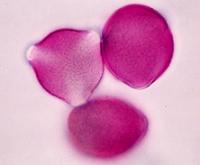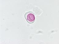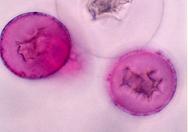 | 染色液をかけた標本を顕微鏡に固定し、スライドグラスの2cm2の花粉をカウント。1cm2あたりに換算して、整数で表す。 | |